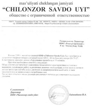 Отзыв о работе ГРП GSA-40 от ООО "Chilonzor Savdo Uni" (Узбекистан)