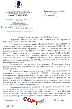 Отзыв о работе регуляторов давления газа от ОАО «Тулаоблгаз»