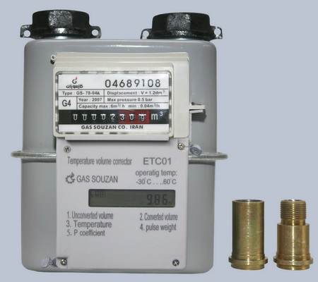 G4A ЕТC (счетчик газа с электронным корректором объема газа по температуре) изготовлены Производственно-промышленной компанией "Газ Сузан" И. Р. Иран, и предназначены для измерения и учета объема прошедшего через счетчик природного газа, паровых фаз бутана, пропана, их смесей по ГОСТ 5542-87, а также других неагрессивных газов. Основная область применения счетчиков - коммунально-бытовое хозяйство, кроме того они могут использоваться и в других сферах деятельности, требующих учета потребления газа. Электронный корректор по температуре обеспечивает приведение прошедшего объема газа через счетчик к нормальным условиям +20 °C и 760 мм ртутного столба (давление газа вводится вручную). Учитывая тот факт, что при отклонении температуры от нормальной (+20 °C) на 3 градуса, реальный объем газа отличается от нормального на 1 процент, счетчик с электронным корректором по температуре является предпочтительным для поставщиков газа. Размеры корректора 2.87 х 11 х 11 см. Корректор включает в себя: электронную плату, литиевую аккумуляторную батарею и жидкокристаллический монитор. Электронная плата принимает сигнал с максимальной частотой 2 Герца. Встроенный порт дает возможность подключения корректора к компьютеру, и считывать информацию. Литиевая аккумуляторная батарея имеет объем 2400 миллиампер в час. Жидкокристаллический монитор также показывает, закрыта или открыта запорная арматура на потоке газа. В рабочем режиме корректор потребляет 8 миллиампер, в пассивном режиме потребление составляет 16 микроампер. Используемые в корректоре температурные сенсоры возможность коррекции с точностью 0,02 градусов Цельсия с рабочей температурой от -55 до 150 градусов Цельсия. Корректор специально создан для мембранных счетчиков "Газ Сузан", что дает возможность подключение его к счетчику без проводов или других подключающих элементов, исключает возможность внешних магнитных воздействий, а в случае такого возможного воздействия сигнализирует об этом. Базовая температура +20°C. Электронный корректор "Газ Сузан" имеет возможность сохранения данных в памяти в течение 12 месяцев.