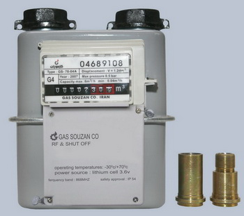 G4A RF&SHUT OFF (счетчик газа с высокочастотным радиопередатчиком и с клапаном отсекателем) изготовлены Производственно-промышленной компанией "Газ Сузан" И. Р. Иран, и предназначены для измерения и учета объема прошедшего через счетчик природного газа, паровых фаз бутана, пропана, их смесей по ГОСТ 5542-87, а также других неагрессивных газов. Основная область применения счетчиков - коммунально-бытовое хозяйство, кроме того они могут использоваться и в других сферах деятельности, требующих учета потребления газа. Счетчик включает в себя: электронную плату, литиевую аккумуляторную батарею и клапан отсекатель. Электронная плата принимает сигнал с максимальной частотой 2 Герца. Встроенный порт дает возможность подключения к компьютеру, и считывания информацию. Литиевая аккумуляторная батарея имеет объем 2400 миллиампер в час. Электронная плата специально создан для мембранных счетчиков "Газ Сузан", что дает возможность подключение его к счетчику без проводов или других подключающих элементов, исключает возможность внешних магнитных воздействий, а в случае такого возможного воздействия сигнализирует об этом. Высокочастотный радиопередатчик (система отправления и получения информации) обеспечивает съем и передачу информации из электронного сумматора на расстоянии до 500 м. от счетчика в закрытом пространстве и до 800 м. в открытом пространстве. Клапан отсекатель, устанавливаемый в корпусе мембранного счетчика обеспечивает перекрытие потока газа абоненту по команде с дистанционного пульта. Электронная плата "Газ Сузан" имеет возможность сохранения данных в памяти в течение 12 месяцев.
